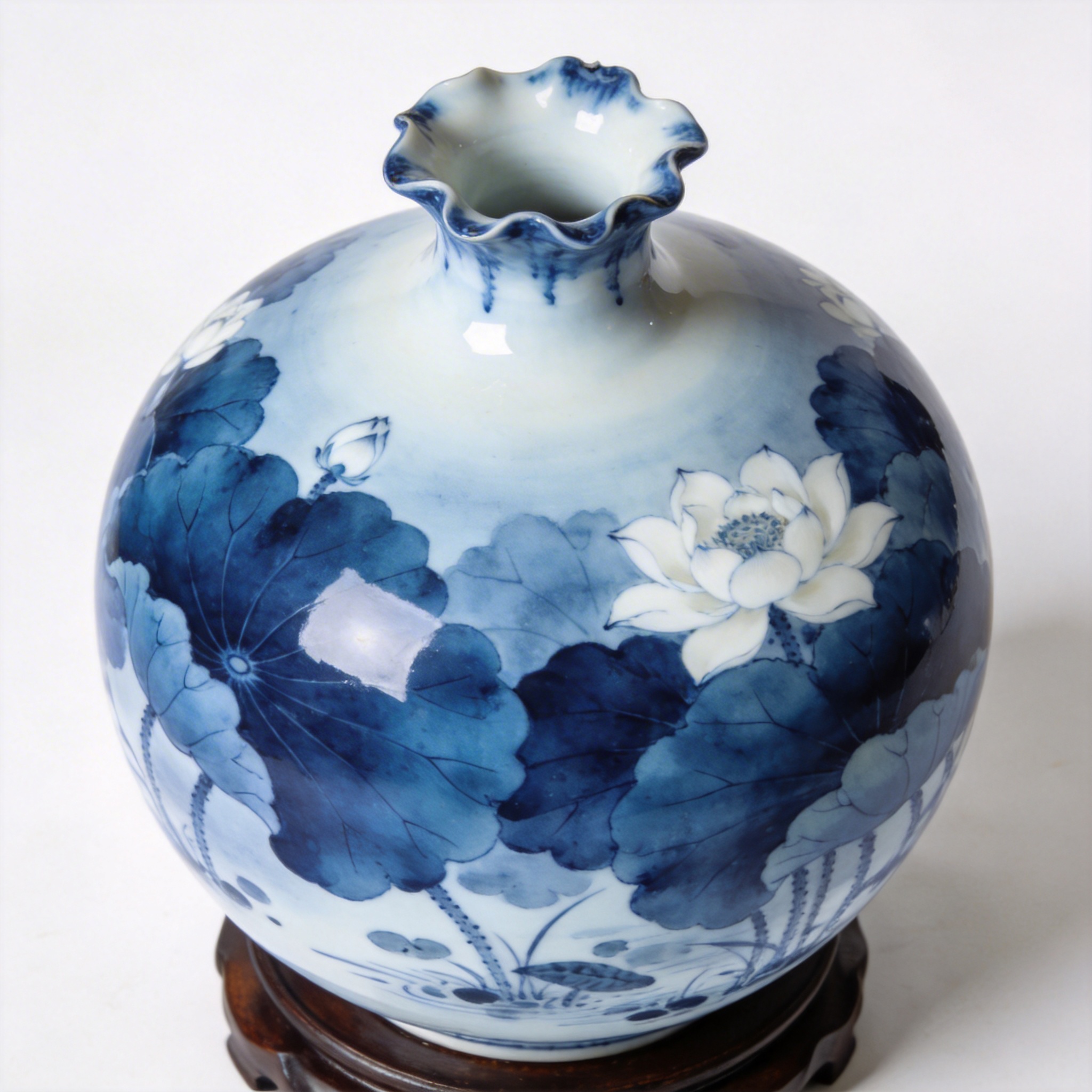 青花分水是现代青花艺术的创新技法,以深浅渐变的蓝色表现画面层次,如水墨画般的晕染效果。荷花纹饰清新雅致,将传统青花与现代审美完美融合。
